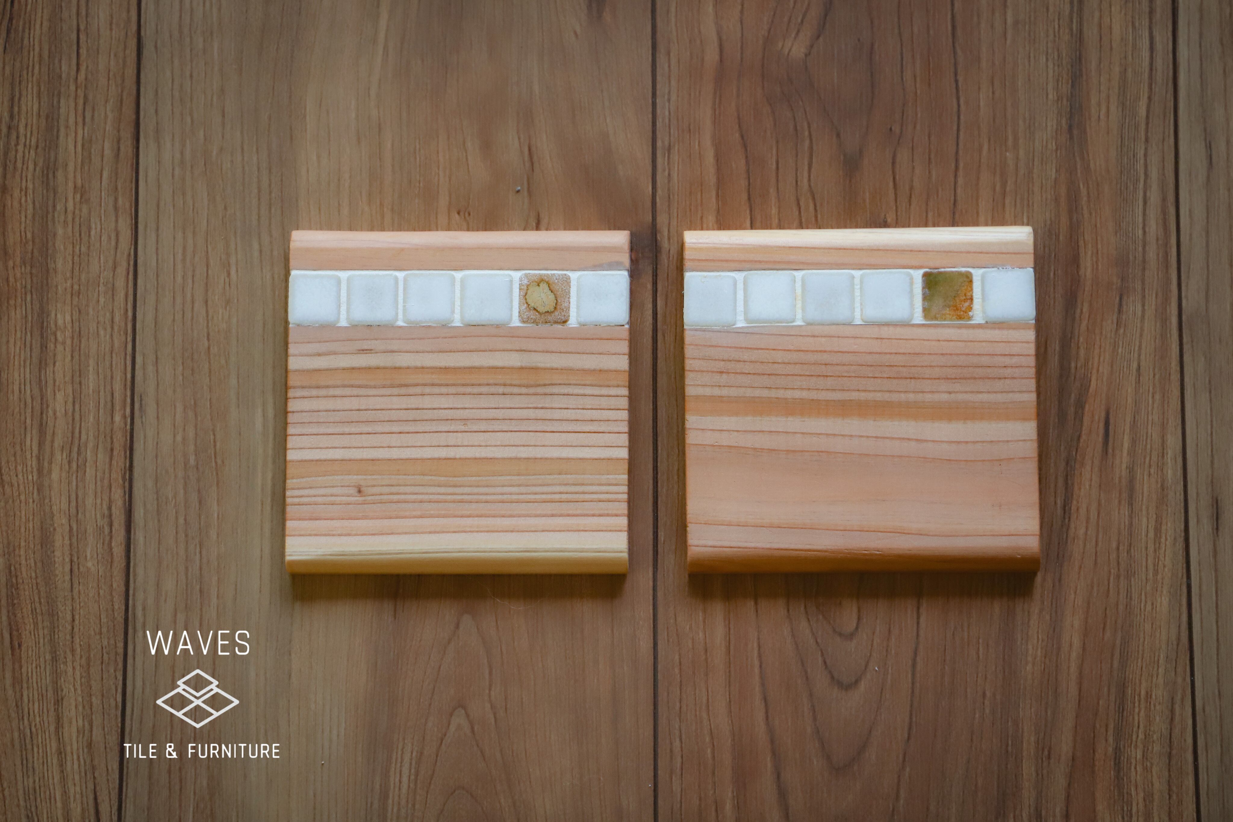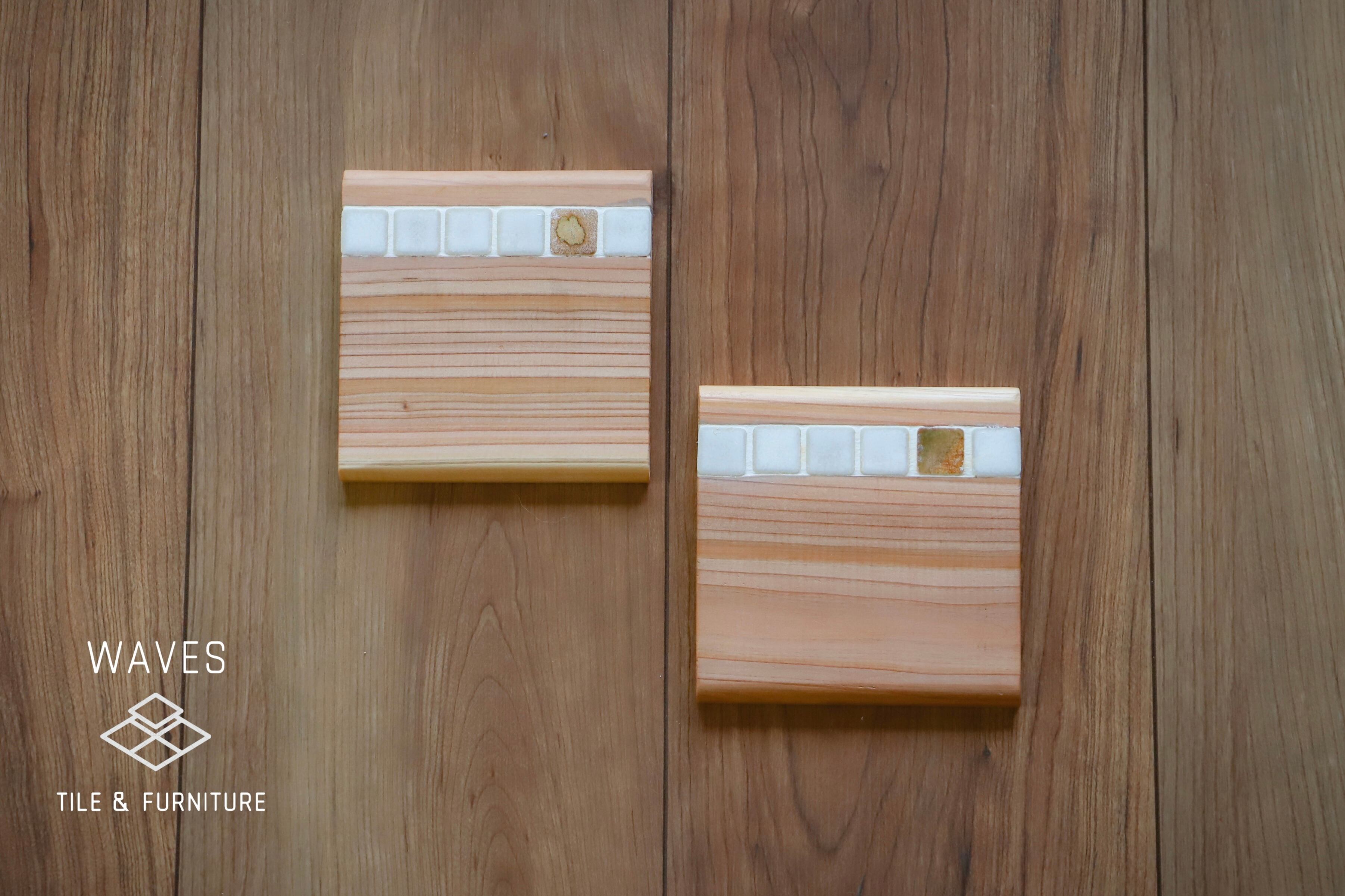 杉の無垢材にタイルを埋め込んだコースター。