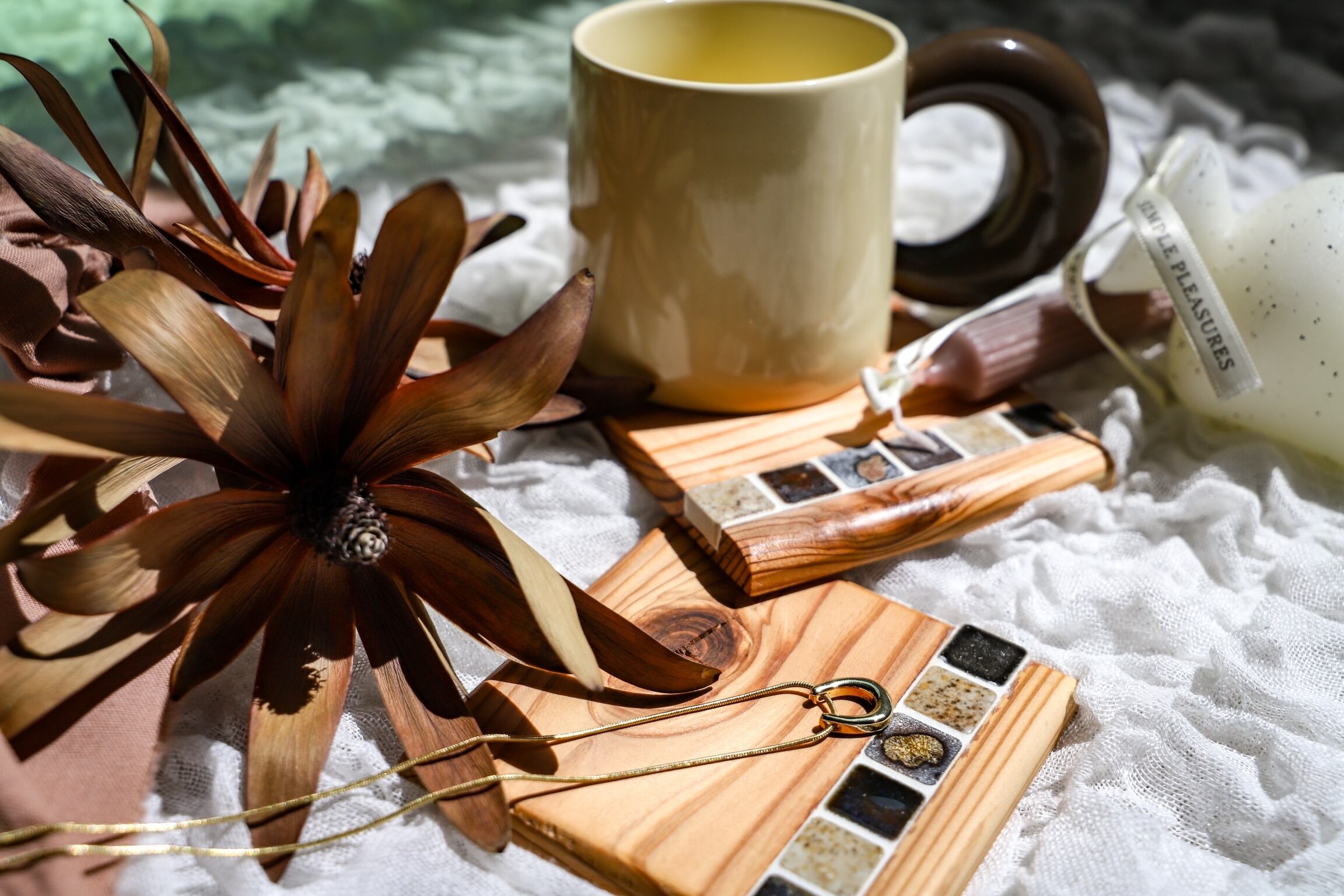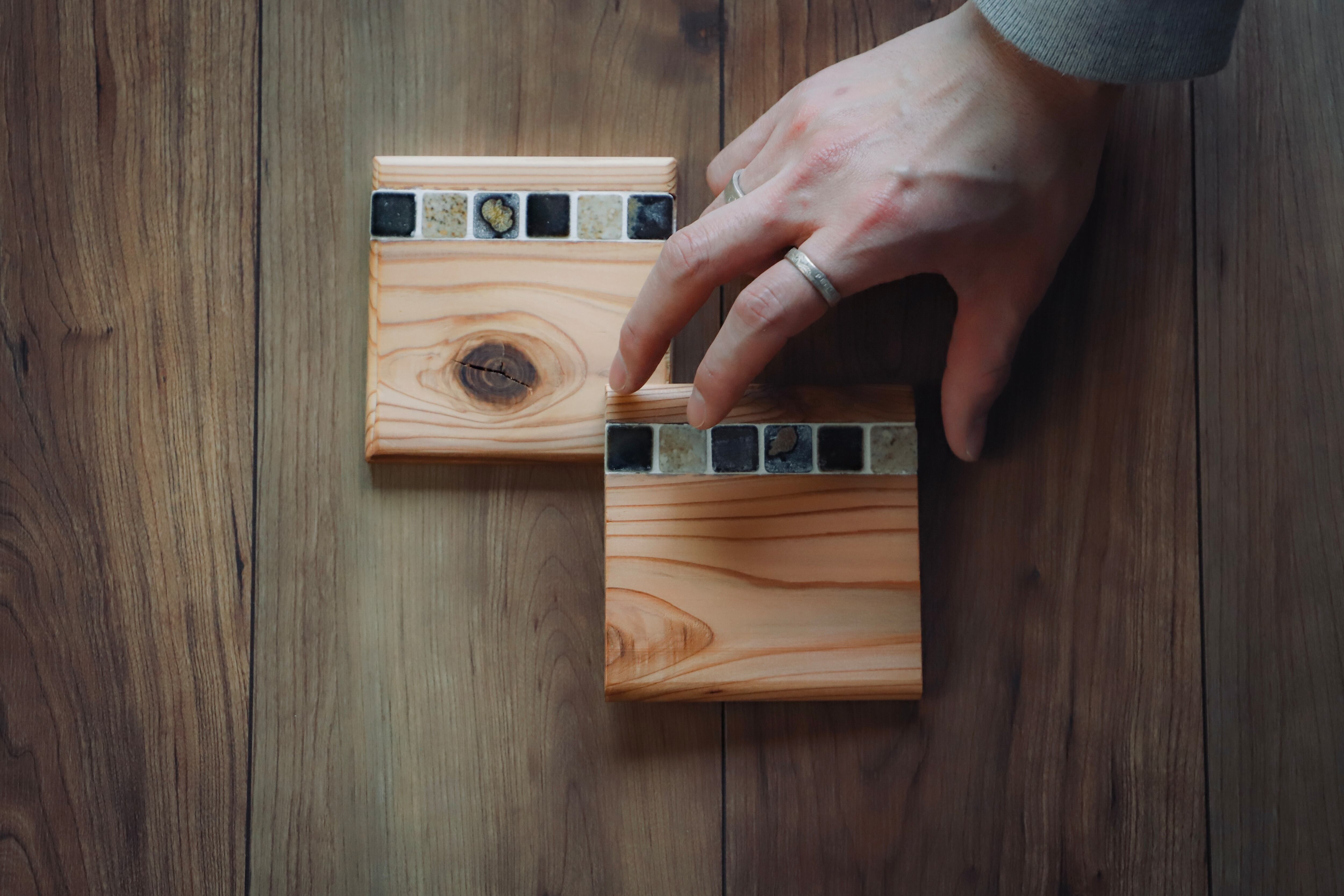 タイルと木を組み合わせたコースターは、